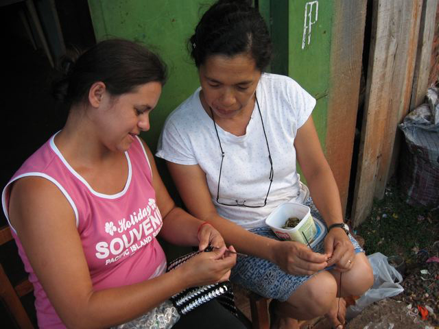 Women’s cooperative program: painting tea towels, making purses and belts from aluminum pull tabs from cans. These were sold at the local weekly crafts market, and Illène sold the “Alluminate Accessories” at Colorado craft fairs to fund education completion: a high school diploma for one woman and a college scholarship for Carine Vieira to run the program in my absence.